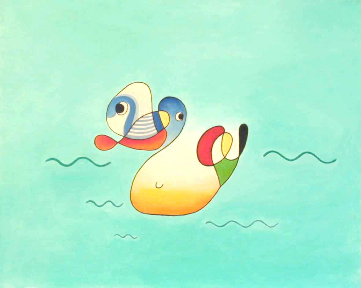 A duck, with a belly button, swims on