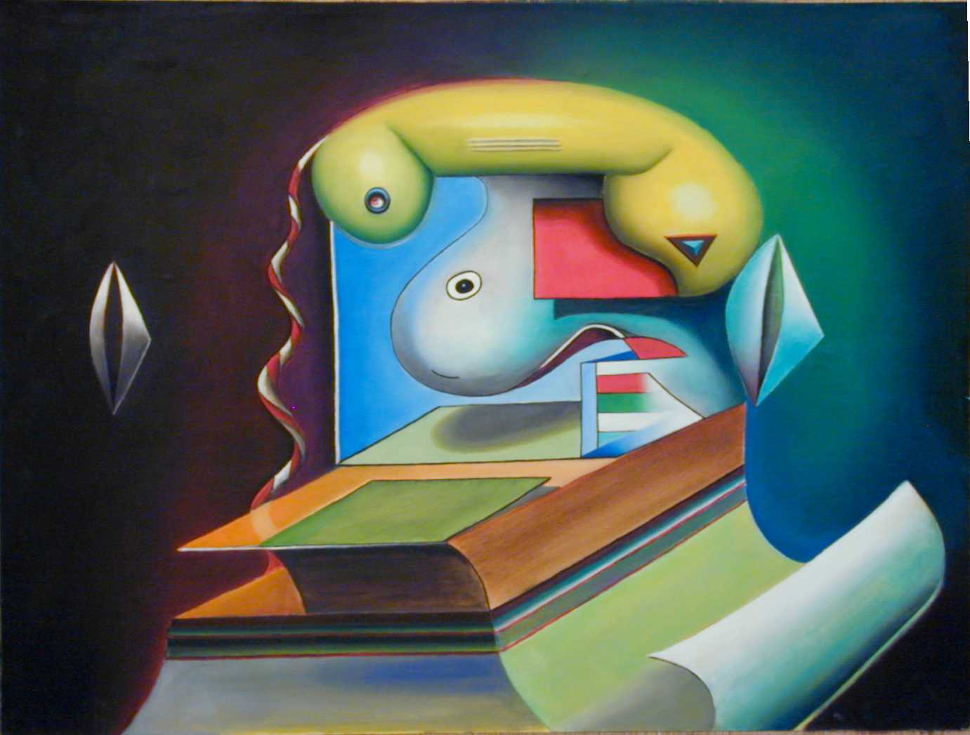 The picture dates back to times when nobody carried a cell phone on a streetcar with them. At that time, even to telephone was astonishing. The picture shows receivers, phonebook, writing paper and attractive shaped shells for transmitting acoustic and electrical waves. By the way, the title of the picture is not yet outdated.